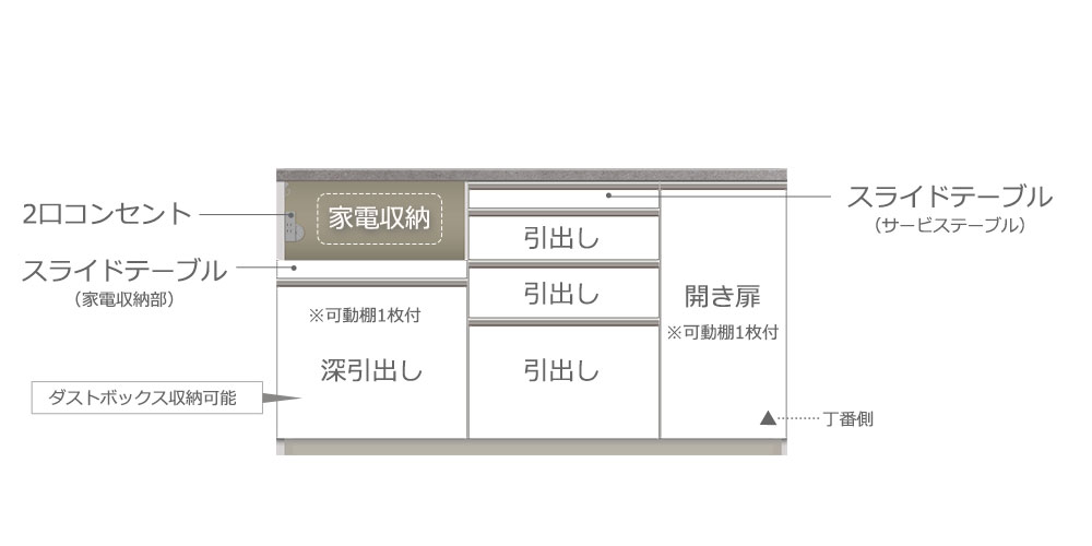 下台家電収納部分:2口コンセント(1500Wまで)X1