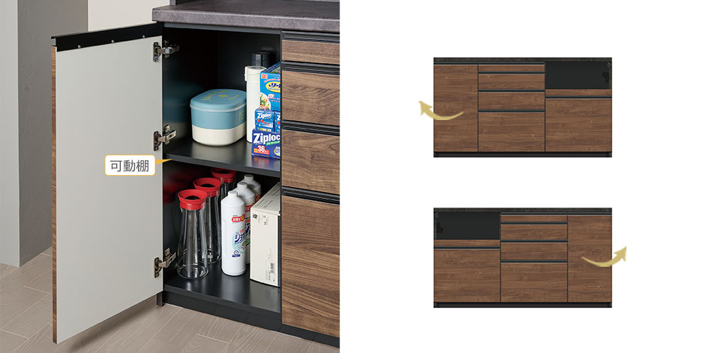 お部屋の間取りに合わせて家電収納部の位置を左右で選べます。※画像はシリーズイメージです(サイズ違いの幅140cm使用)。