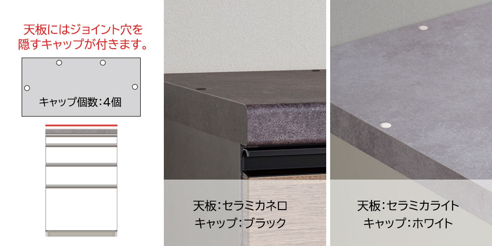 オープンボードの下台のみをカウンターとしてお使いいただく仕様です。そのため、天板には上台とのジョイント穴を隠す樹脂製のキャップが4箇所付きます。パールホワイト色にはホワイト、TJN10200K(ボディ:セラミカネロ)色にはブラックのキャップが付属します。予めご了承ください。※画像はイメージです。