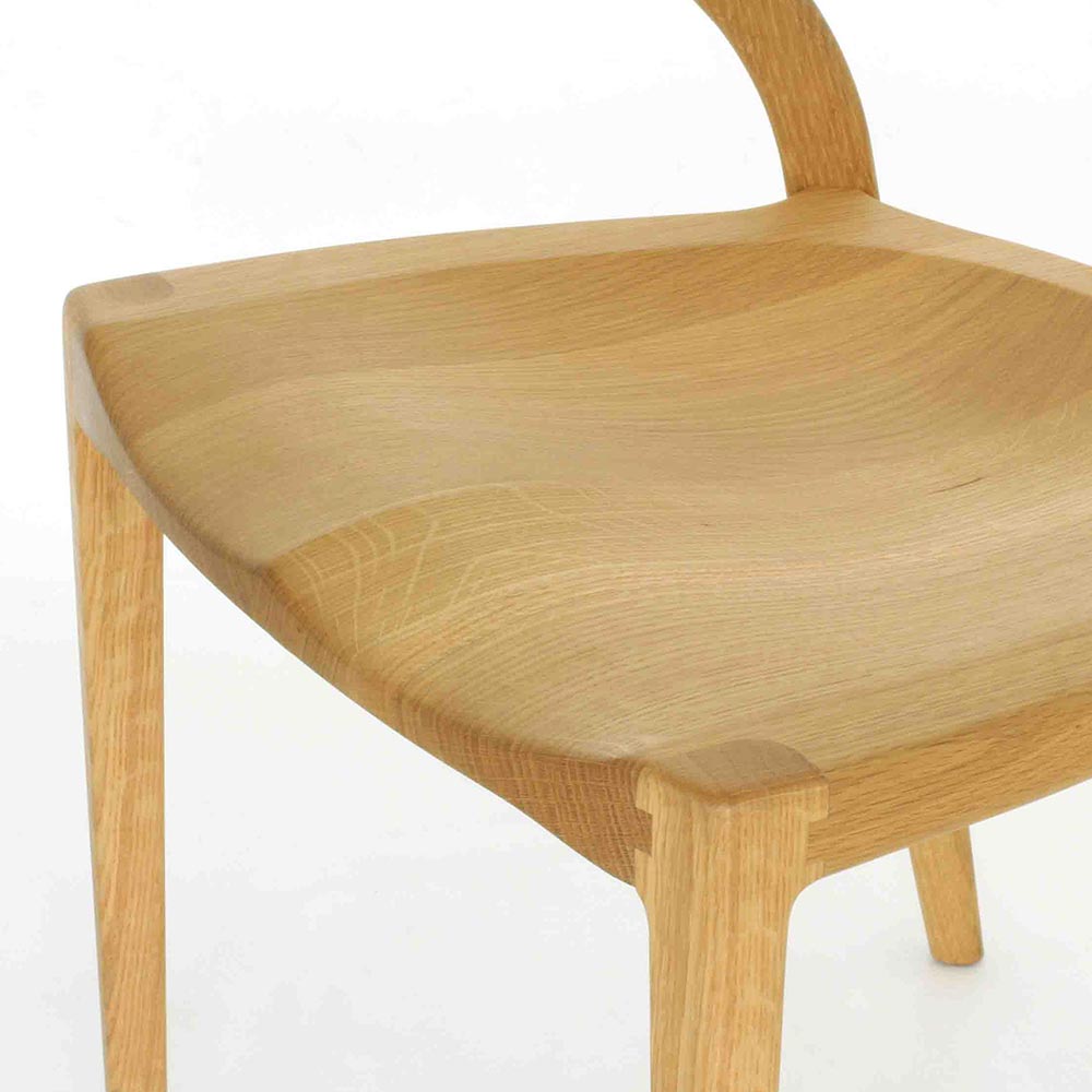 無垢材を贅沢に使用して、背・座ともに深く削り込むことで、自然と身体になじむような掛け心地の良い椅子に仕上げています。座面は厚み52mmの無垢材を使いザグリ部分を深くすることにより、長時間座っていても疲れにくいフィット感を実現しています。※座面の仕上げ厚は45mmとなります。