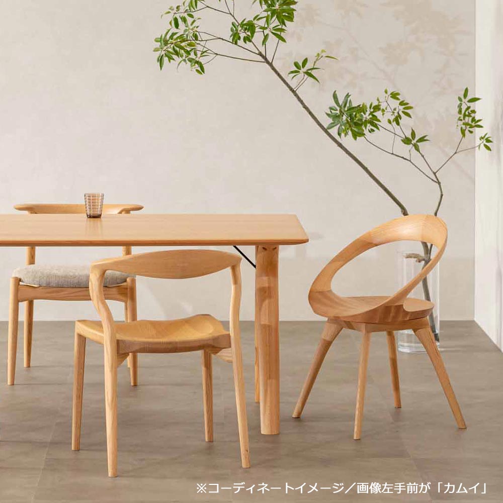厚みのある木材を使用した座面が木のぬくもりや存在感をしっかりと感じさせながらも、背から後足への流れるようなラインと、座面と前脚が一体となったようなシンプルなデザインにより、すっきりと洗練された印象です。※画像はコーディネートイメージです。画像中央の椅子が「カムイ」です。