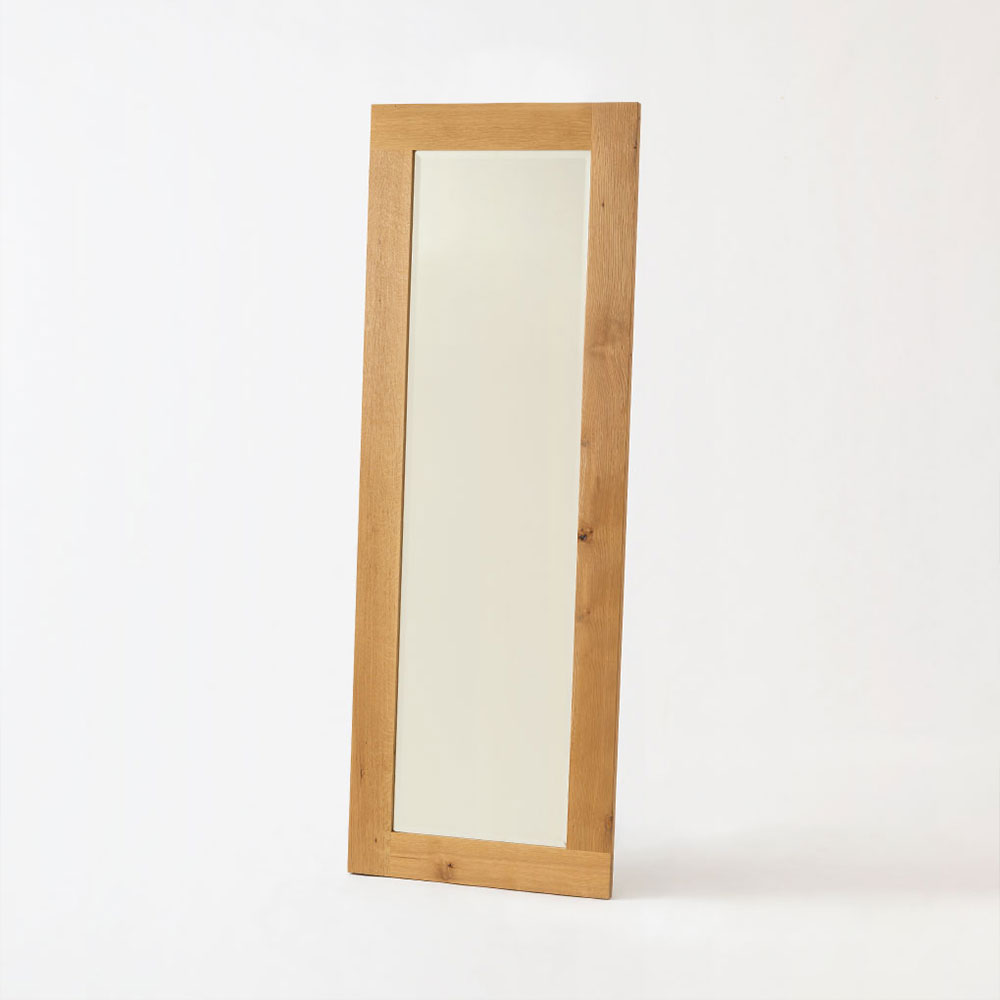壁に立て掛けて使う置きミラーです。シンプルなデザインはさまざまなお部屋にマッチします。※画像はイメージです。天然木を使用しているため、木目や、節の数、色の濃淡などは一点ごとに異なります。