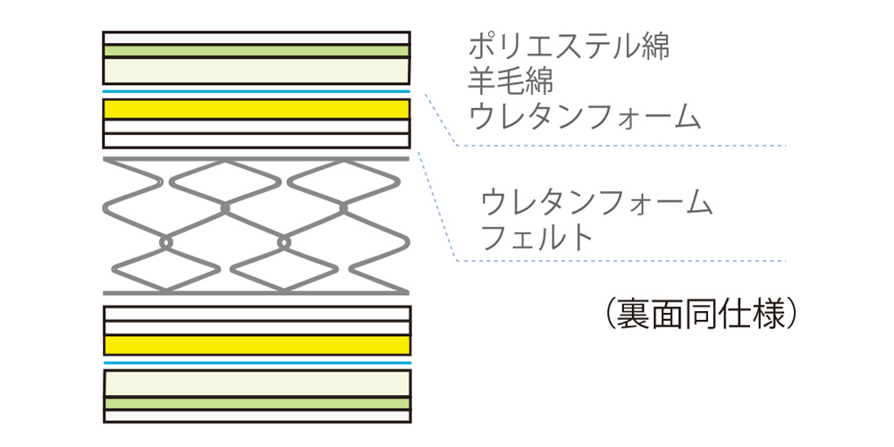 高密度連続スプリング®に羊毛綿、ウレタンフォームを肌ざわりの良い生地で包んだ安定感のあるしっかりとした寝心地です。