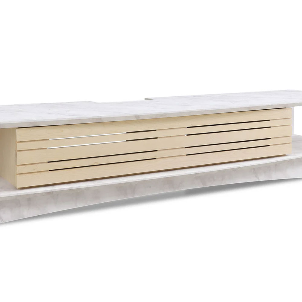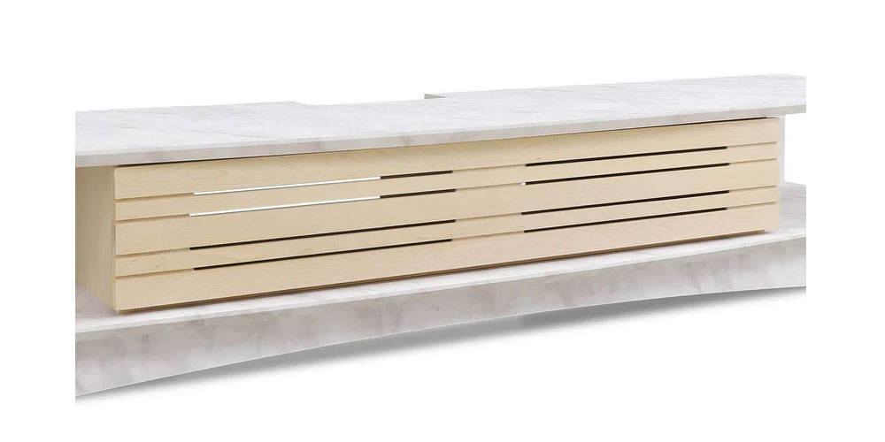 バーチ無垢材で仕上げたスリットデザインの扉が印象的で、内側にセンサーのみ通過させるガラスを貼ることで、扉を閉じたままリモコン操作ができ、ボード内へのホコリやゴミの侵入を防ぐなど使用時の見た目と実用性を両立しています。