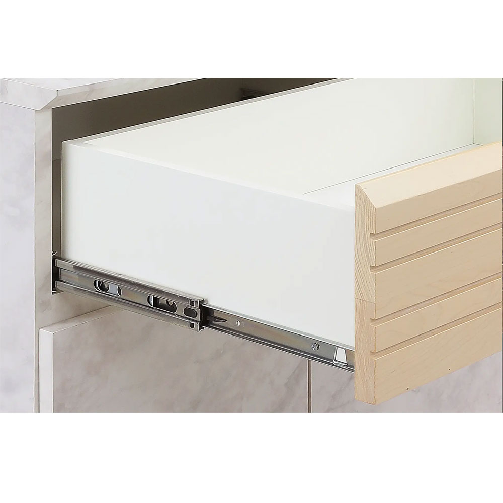 引出しはホワイトラッピング仕様で、スムーズな出し入れを可能とするフルスライドレールがついています。