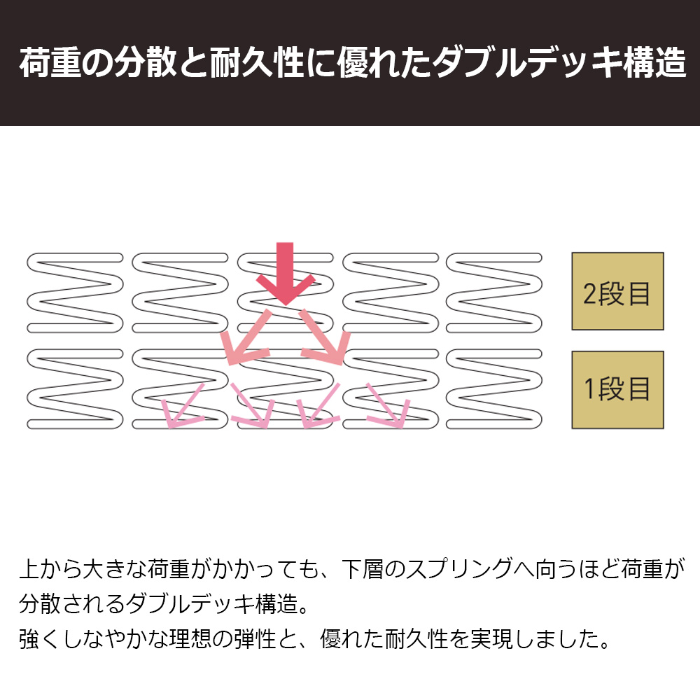 ダブルデッキ仕様にすることで、上から掛かる荷重が下層のスプリングへ向かうほど分散されます。強くしなやかな理想の弾性と、優れた耐久性を実現しました。