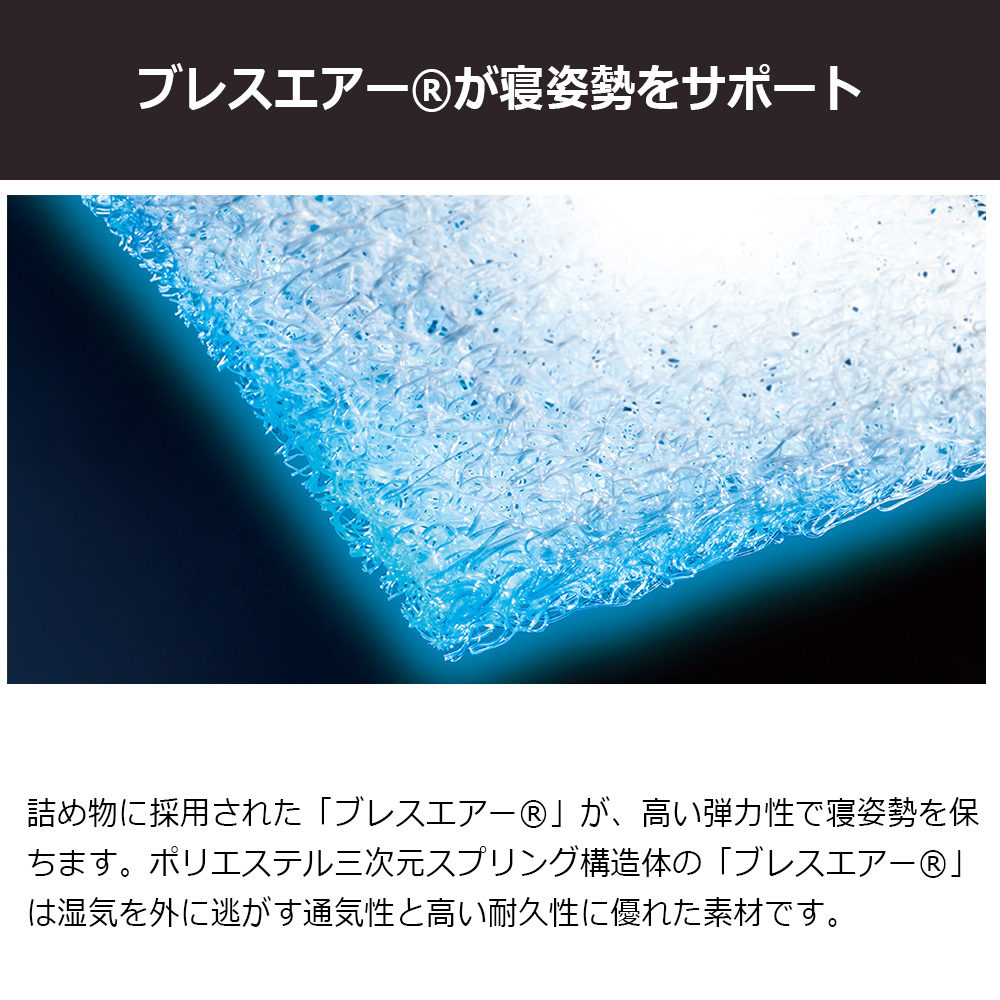 ポリエステル三次元スプリング構造体の高い弾力性で寝姿勢をサポートします。抜群の通気性で内部に湿気を溜め込まず、いつでも爽やかな寝心地を実現します。従来の「ブレスエアーエクストラ®」よりも反発弾性を高めており、よりハードながらクッション性も兼ね備えています。※画像はイメージです。