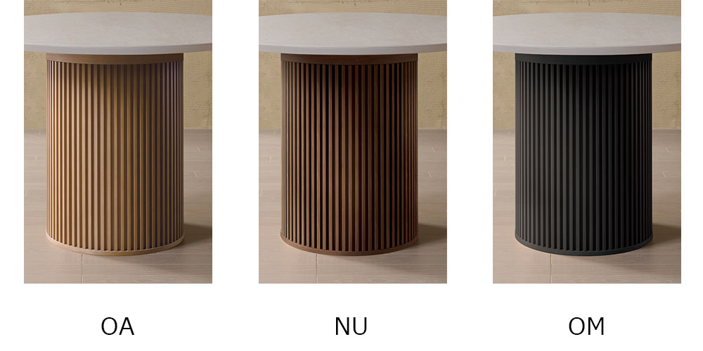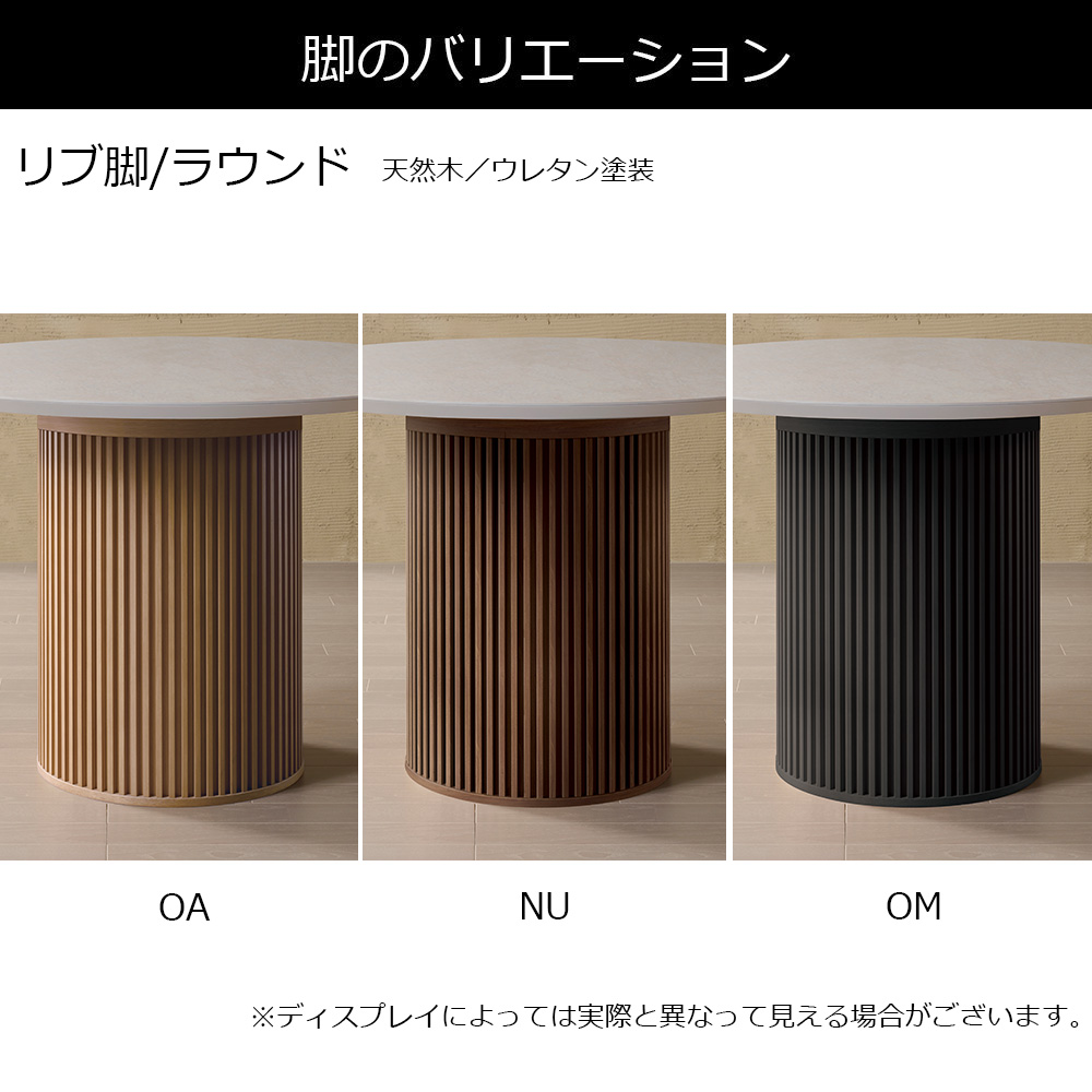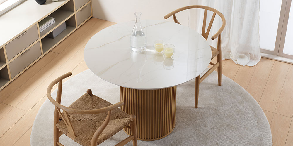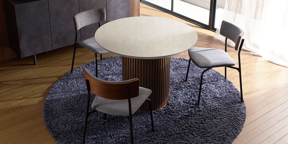 イタリア製のセラミック素材を使用した天板と天然木のリブ脚。お部屋のインテリアに合わせて天板と脚を組み合わせることができる円形のダイニングテーブルです。洗練された美しさをインテリアにもたらします。