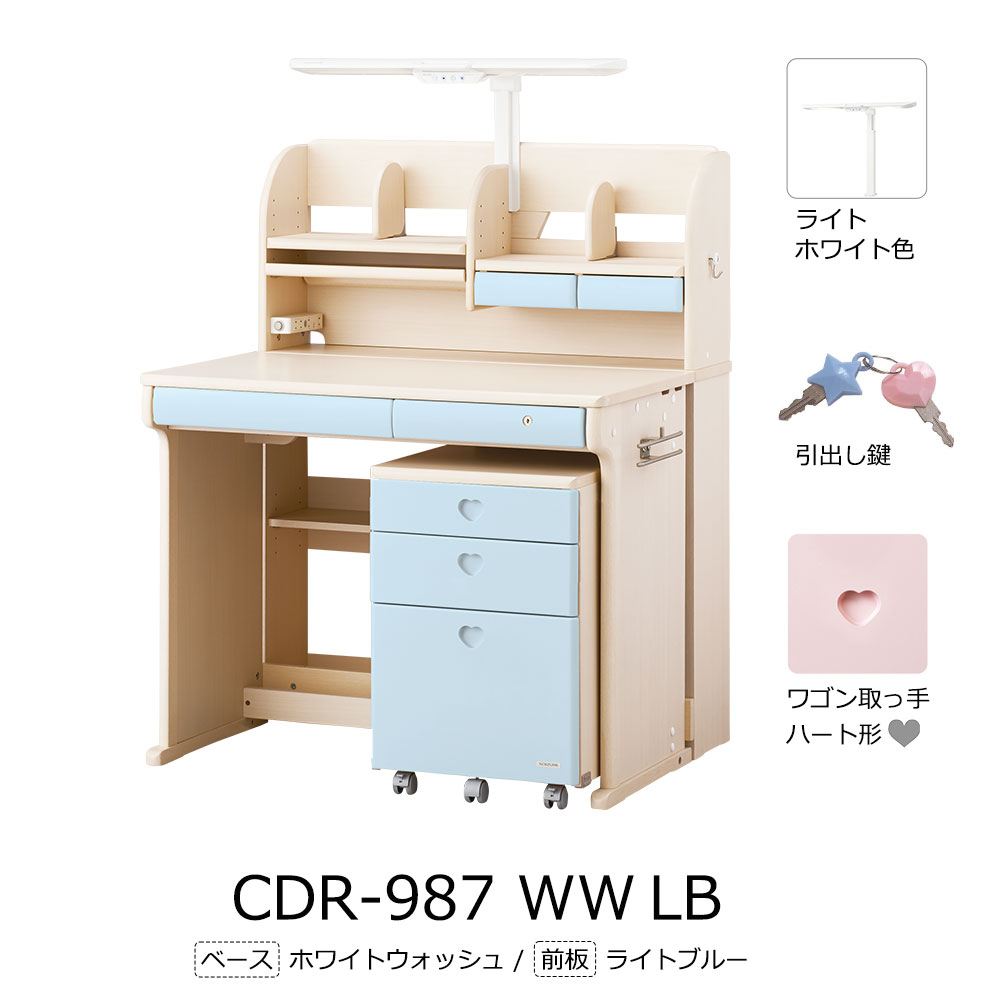 ベースカラー「WWホワイトウォッシュ」色は、丸みを帯びたラインがかわいらしいデザインです。ワゴンの取っ手と鍵がハート形になっています。