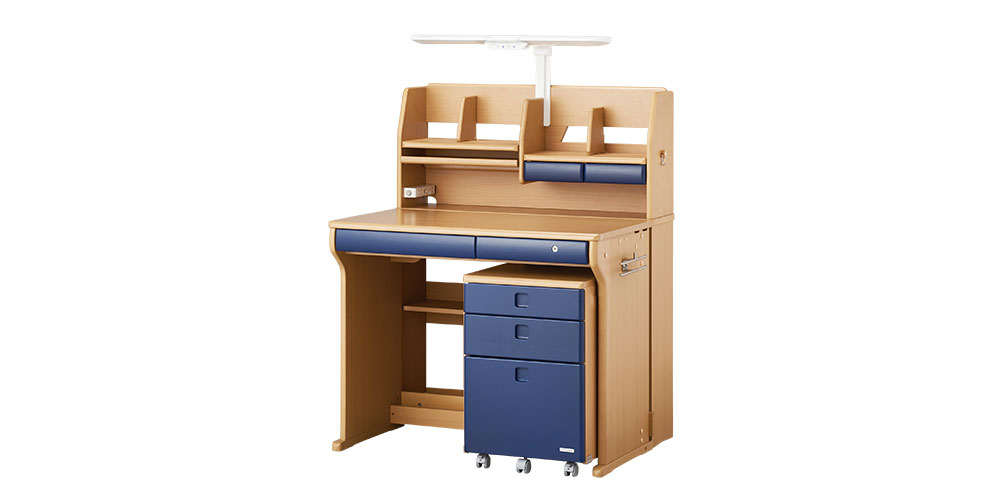 デスクの右側引出しには、文房具の整理に便利な「おかたづけキット」付き。さらに整理しやすいようタグも付いています。