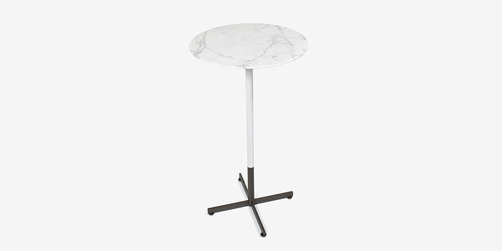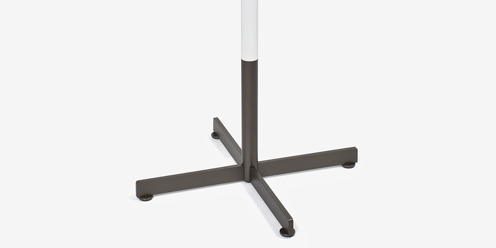 ベース下部はサテン仕上げのバーニッシュドスチール製で、クロスデザインがアクセントになっています。脚の上部は天板に合わせたカラーのホワイトで仕上げています。