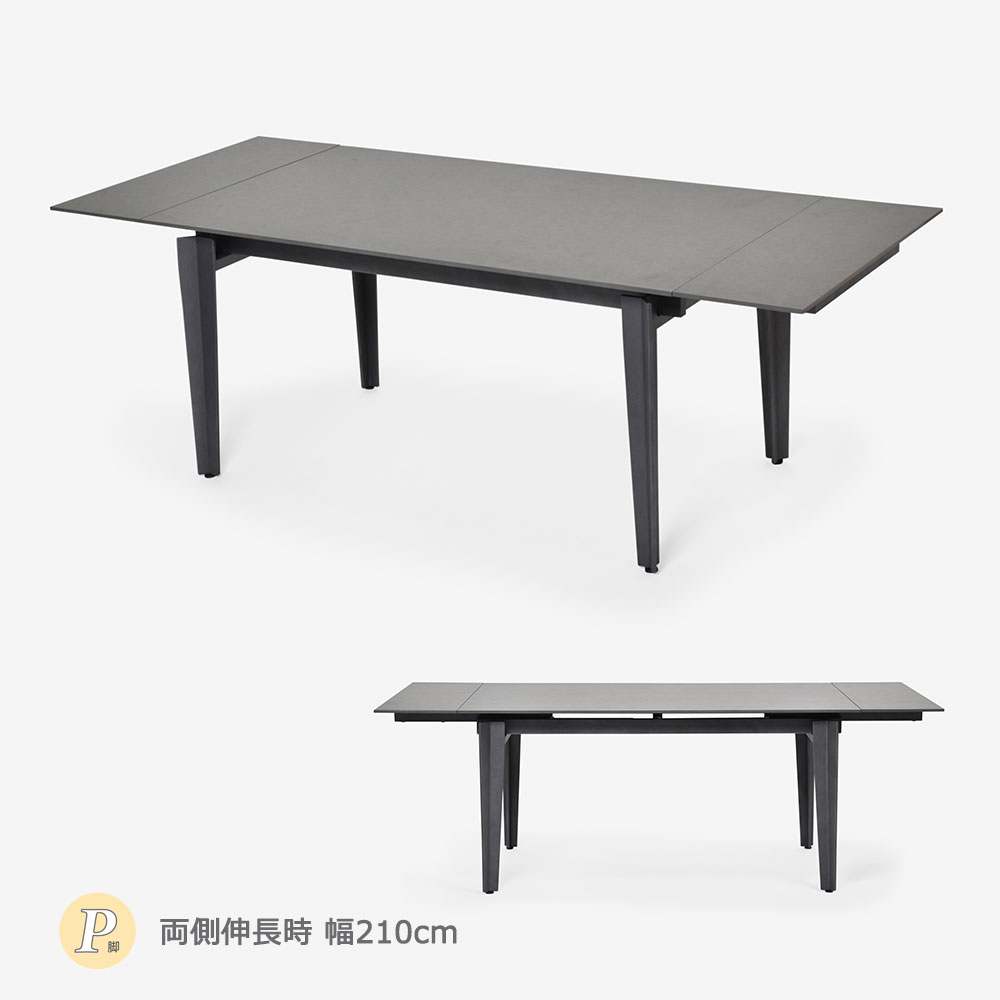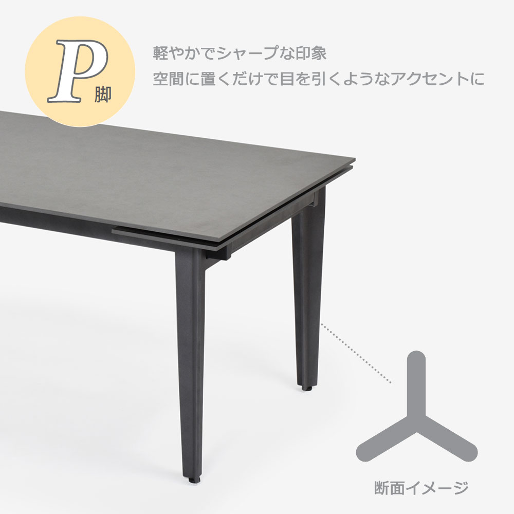 洗練されたデザインと機能性が一体化したセラミックテーブルです。※画像はP脚タイプの通常時幅150cmのイメージです。
