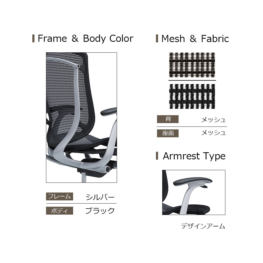 「コンテッサセコンダ」座面/メッシュ フレーム/シルバー ボディーカラー/ブラック ハイバック デザインアーム 張地全13色 ランバーサポート有・無【受注生産品】okamura(オカムラ)