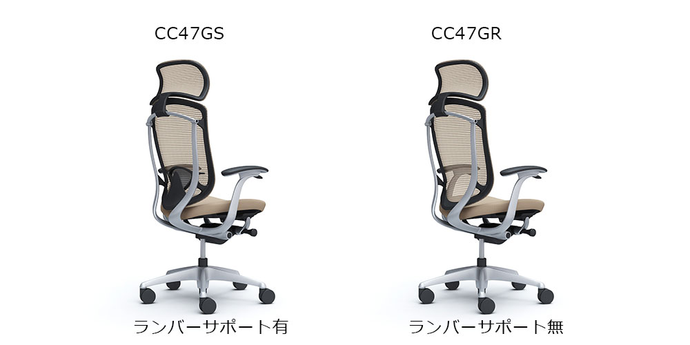 腰を心地よくホールドするランバーサポート有「CC47GS」または、ランバーサポート無「CC47GR」からお選びいただけます。※画像の張地はFPC7(ベージュ)を使用しています。