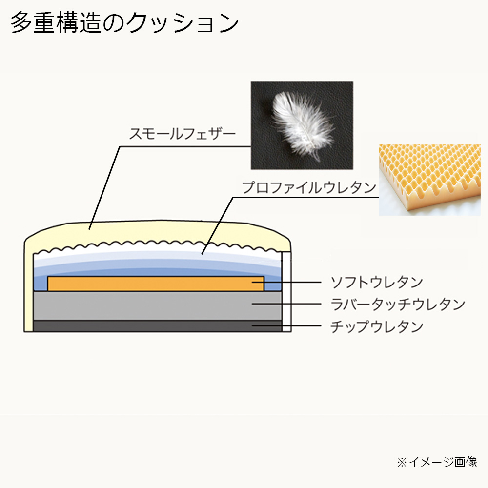 座クッションの表層部に採用したスモールフェザーは、羽根の芯となる部分が細いため、繊維な柔らかさと高い復元力が特長です。また、湿気を吸収し発散する性質があるため、クッションの内部材に適しています。