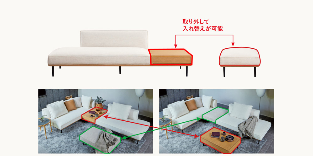 スツールのクッション部分と別売りの引出し付きサイドテーブルの上部は取り外しができます。上部を入れ替えることでスツールをセンターテーブルとしてお使いいただけます。