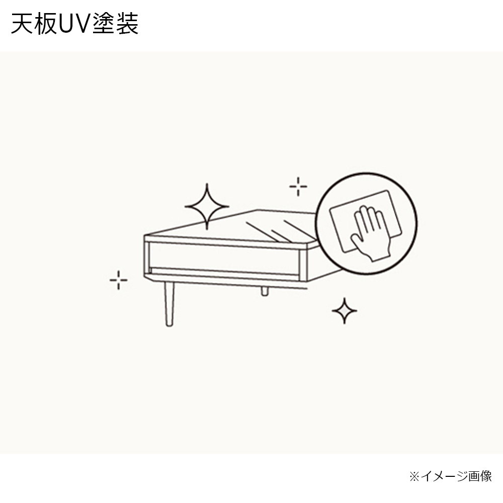 引出しは前後ともにA3サイズが収納可能です。天板にはキズや汚れに強いUV塗装が施されています。普段のお手入れは、よく絞った布で拭くだけなので、煩わしいメンテナンスも必要ありません。