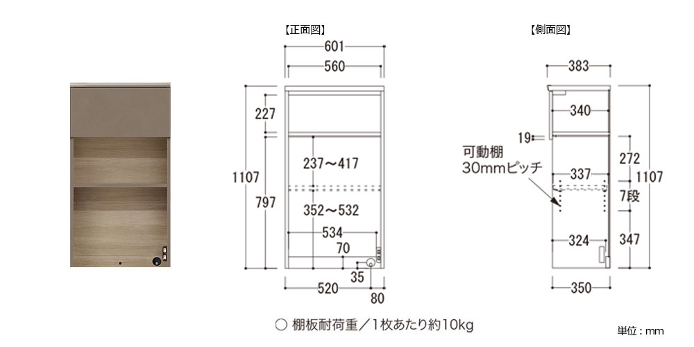 オーブンレンジや炊飯器などの外部に蒸気や熱を放出する物を収納する場合は、ご使用になる家電製品の取り扱い説明書に従ってください。