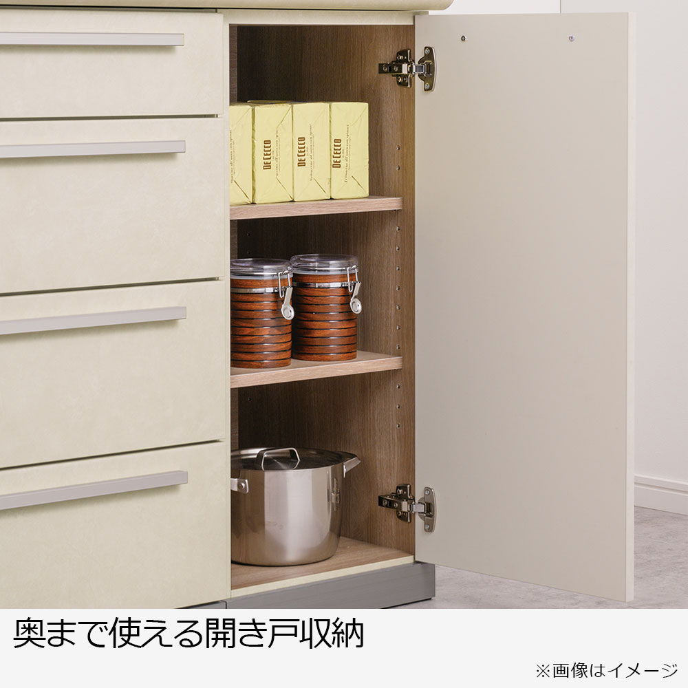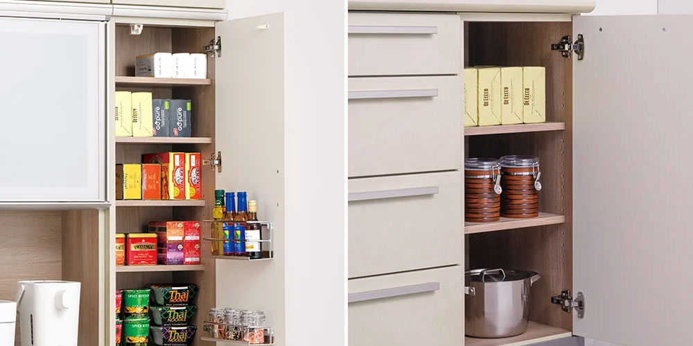 上台は保存食等をたくさん収納できるパントリータイプ。下台は奥まで使える開き戸収納。