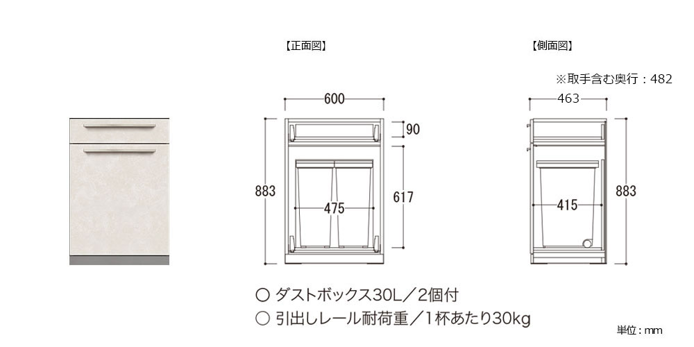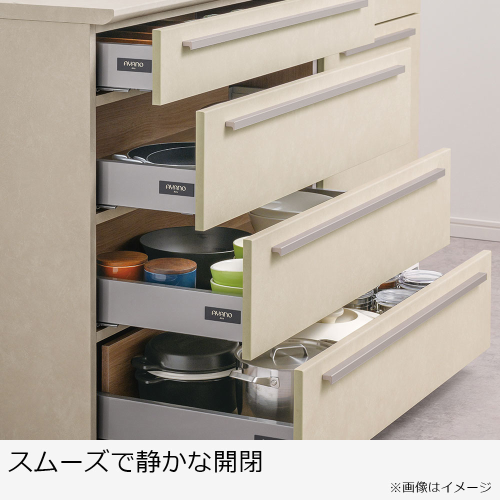 ダストボックス内蔵の2段引出しには容量30Lのダストボックスが2個付属します。4段引出しは使い勝手が良く、細かく分類して収納できます。