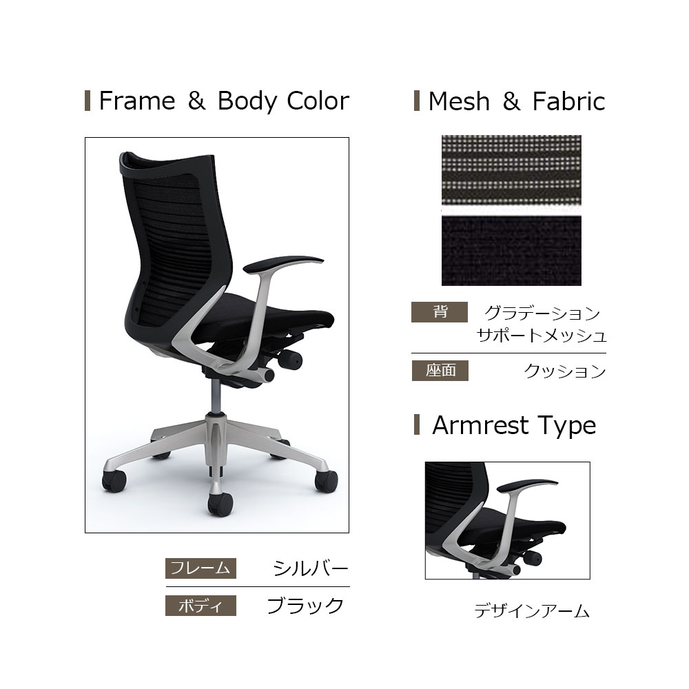 「バロンチェア CP43DR-FGR」ローバック 座面/クッション 背/グラデーションサポートメッシュ フレーム/シルバー ボディーカラー/ブラック デザインアーム 張地全6色【受注生産品】okamura(オカムラ)