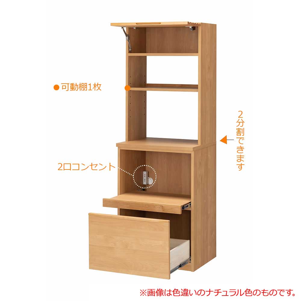 上台の上部はフラップ扉(引き上げ扉)で中が見渡しやすく、出し入れが楽に行えます。下台には家電収納スペースと深引出し収納があり機能的にお使いいただけます。オープンシェルフ部分には可動棚が1枚あり50mmピッチ7段階で調整可能で、キッチンツールや食器類などお気に入りのアイテムを並べてインテリアとしても楽しめます。