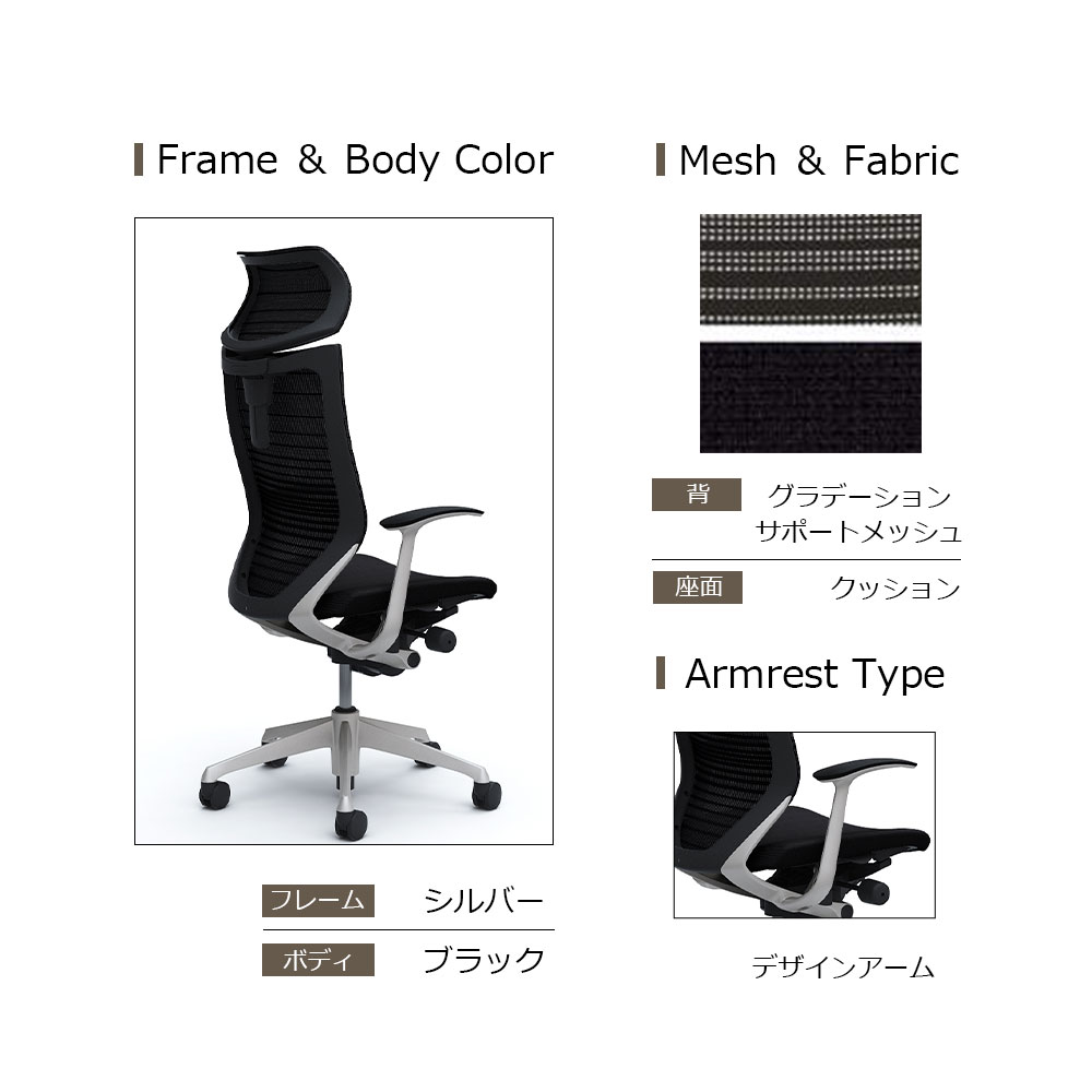 「バロンチェア CP41DR-FGR 」エクストラハイバック 可動ヘッドレスト 座面/クッション 背/グラデーションサポートメッシュ フレーム/シルバー ボディーカラー/ブラック デザインアーム 張地全6色【受注生産品】okamura(オカムラ)