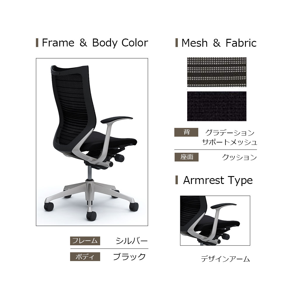 「バロンチェア CP45DR-FGR」ハイバック 座面/クッション 背/グラデーションサポートメッシュ フレーム/シルバー ボディーカラー/ブラック デザインアーム 張地全6色【受注生産品】okamura(オカムラ)