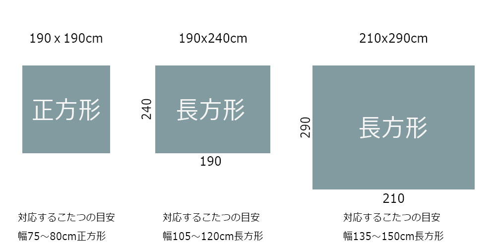 インテリアに合わせやすい北欧風デザインのこたつかけ布団。正方形190x190cm、長方形190x240cm、210x290cmの3サイズ。