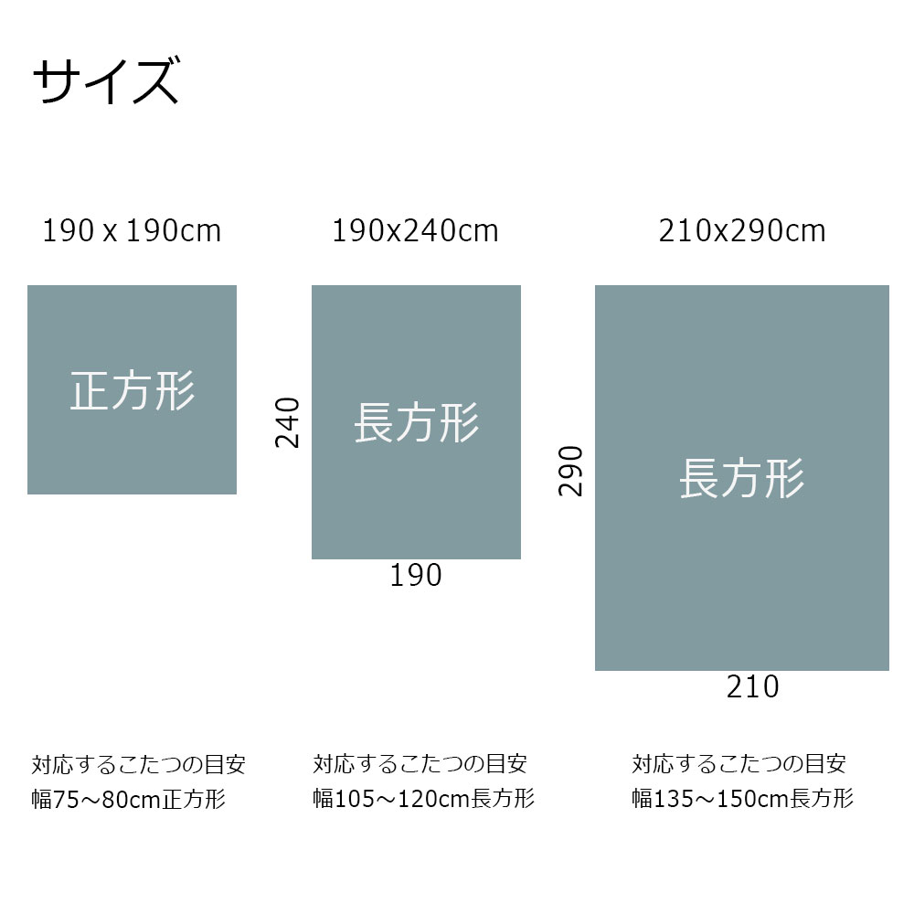 インテリアに合わせやすい北欧風デザインのこたつかけ布団。正方形190x190cm、長方形190x240cm、210x290cmの3サイズ。