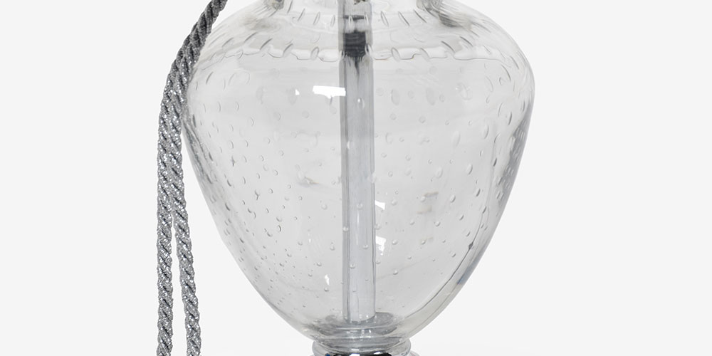 本体のガラスパーツにはイタリアガラス伝統技法の「bullicante(ブリカンテ)」を使用しています。2層構造のガラスで、1層目に金型で無数の気泡の穴をあけ、2層目で表面をふさぎます。
