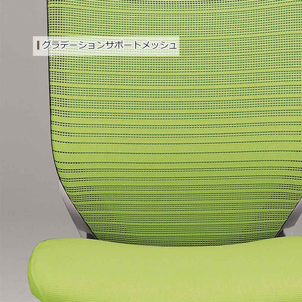背のメッシュ部分の織りに濃淡をつけ、座り心地を向上させた「グラデーションサポートメッシュ」仕様です。しっかりサポートしたい腰まわりは密度を細かくし、背中の部分は密度を粗くしてソフトにフィットします。