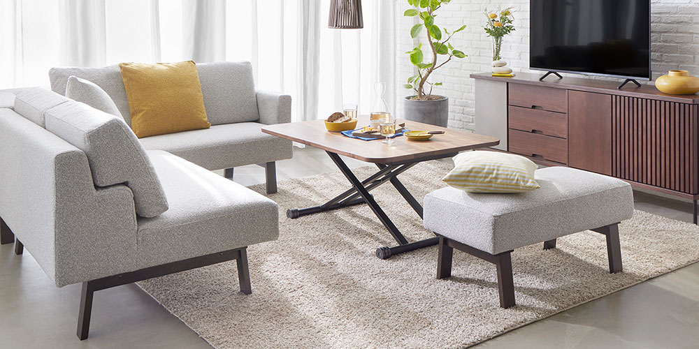 リビング・ダイニング兼用で使用できるソファ「アレッタ2」シリーズのスツールです。同シリーズのソファと並べてサイズを調整したり、オットマンとして脚を伸ばしてくつろいだり、様々なレイアウトが可能です。