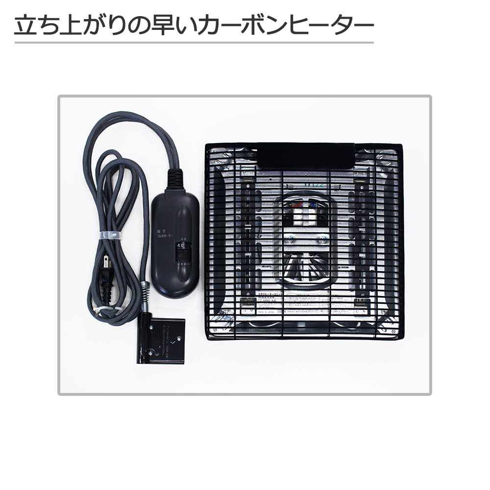 手元で温度調節ができる電子コントローラー付きカーボンヒーター。暖房効率がよく、立ち上がりの早いヒーターです。ヒーターは1年保証付き。
