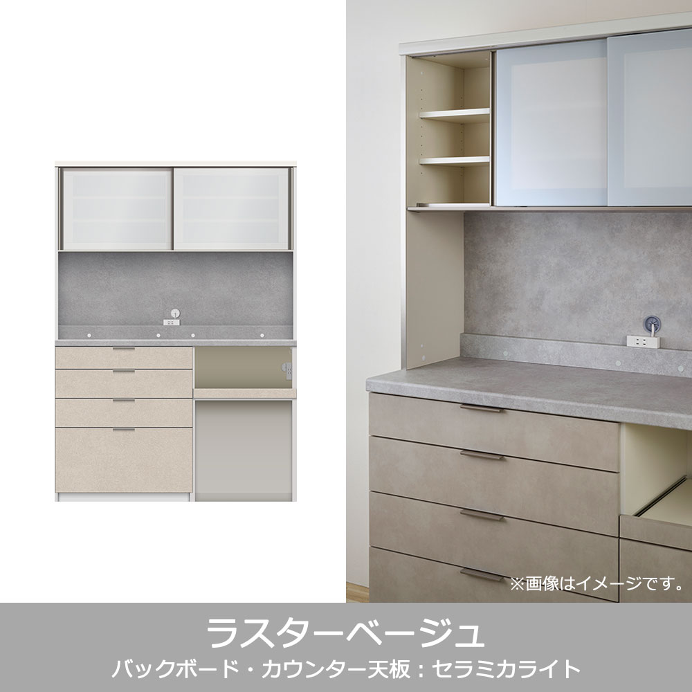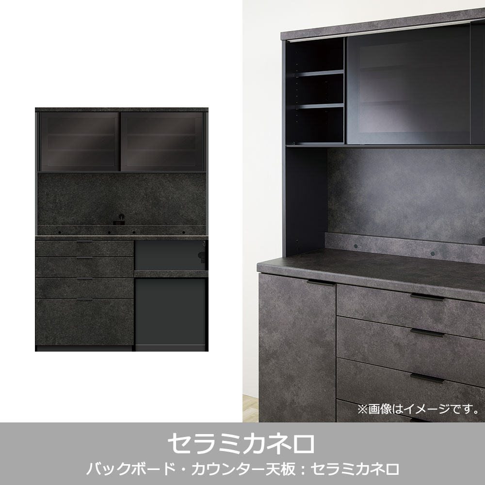 キッチン収納に必要な機能がまとまったハイカウンタータイプの食器棚です。家電収納下はストック品やダストボックスの収納に便利なオープンタイプです。※画像はイメージです。