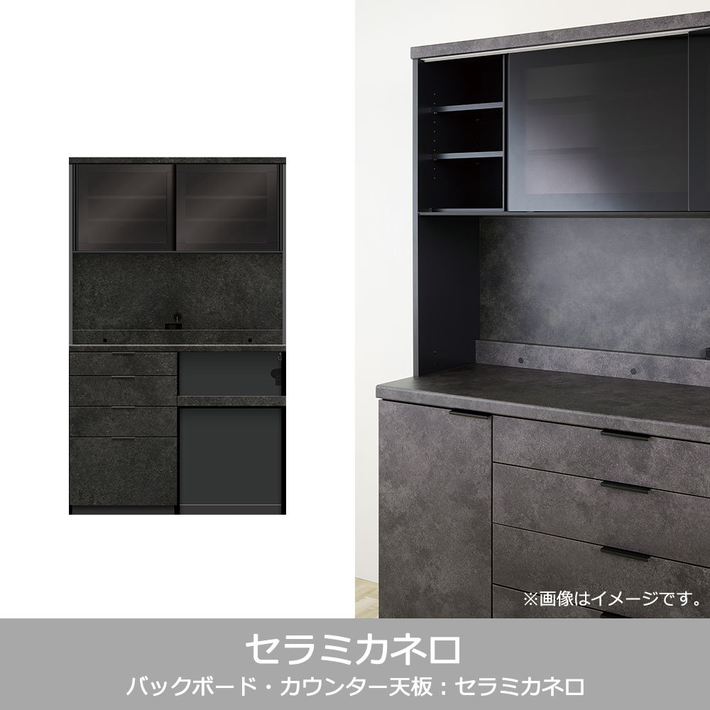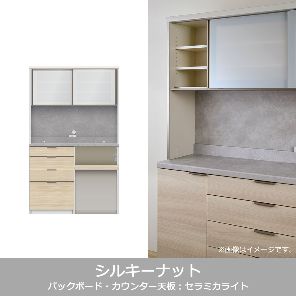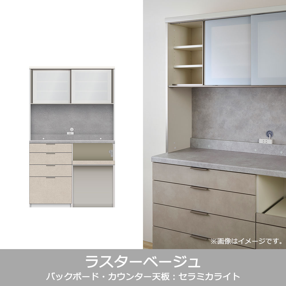 キッチン収納に必要な機能がまとまったハイカウンタータイプの食器棚です。家電収納下はストック品やダストボックスの収納に便利なオープンタイプです。※画像はイメージです。
