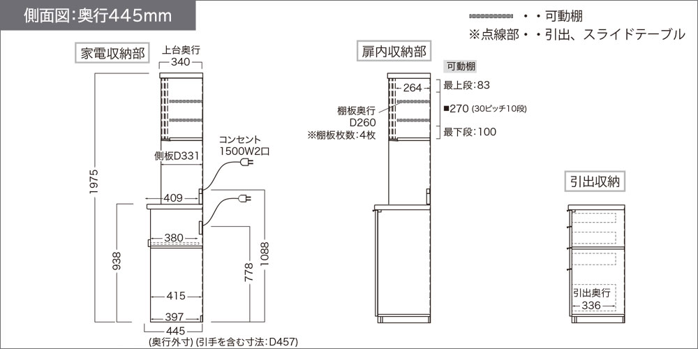 奥行445mmタイプの側面図(単位:mm)