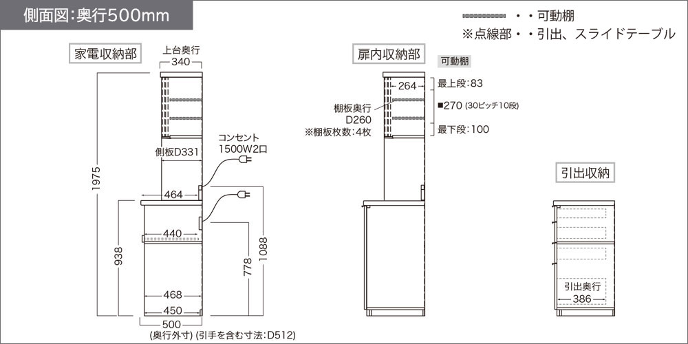 奥行500mmタイプの側面図(単位:mm)