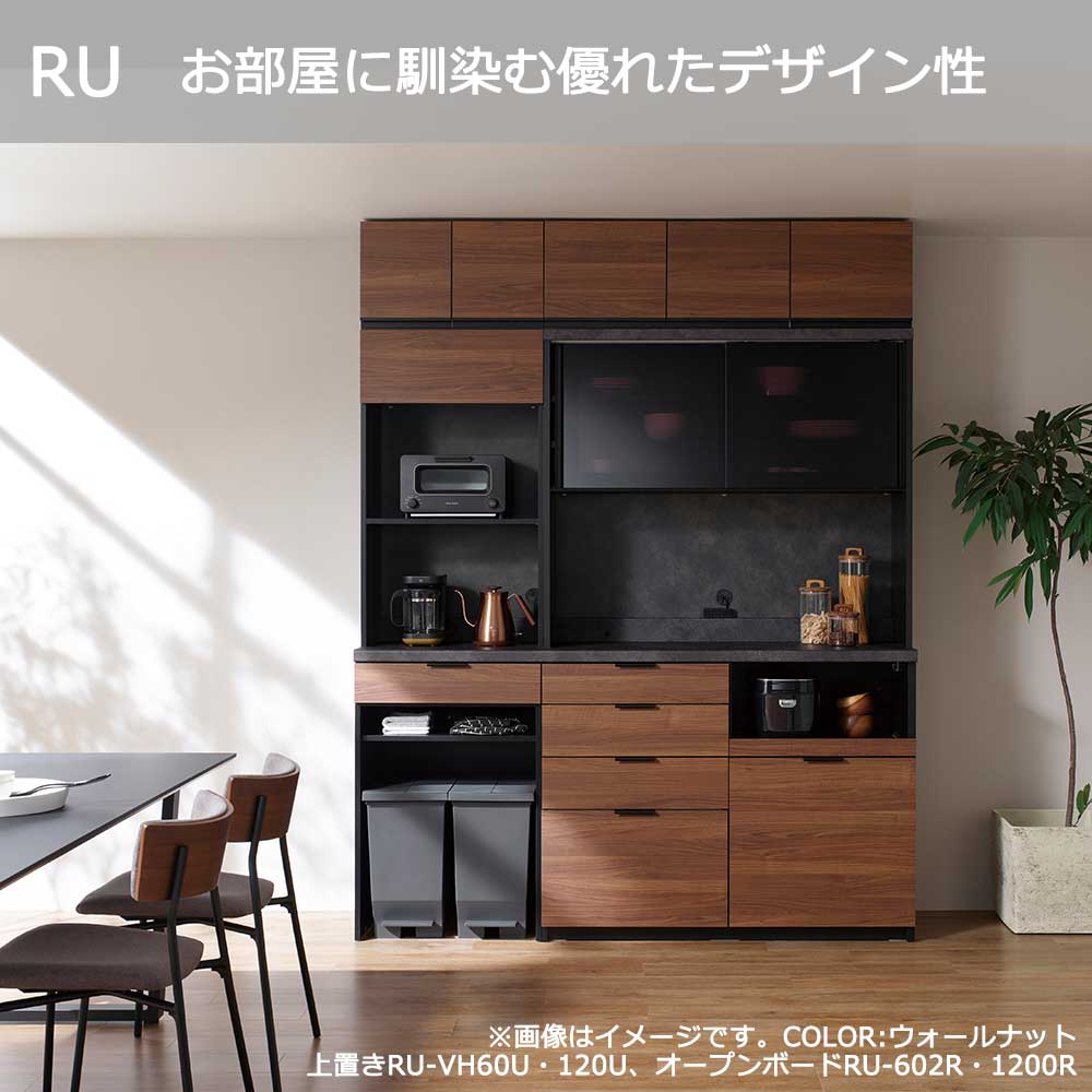 キッチンやリビングダイニングのインテリアに合わせて4色からお選びいただけます。幅60cmのオープンボードと並べることでダストボックスや家電の収納スペースがより充実します。※画像はRUシリーズウォールナット色のイメージです。
