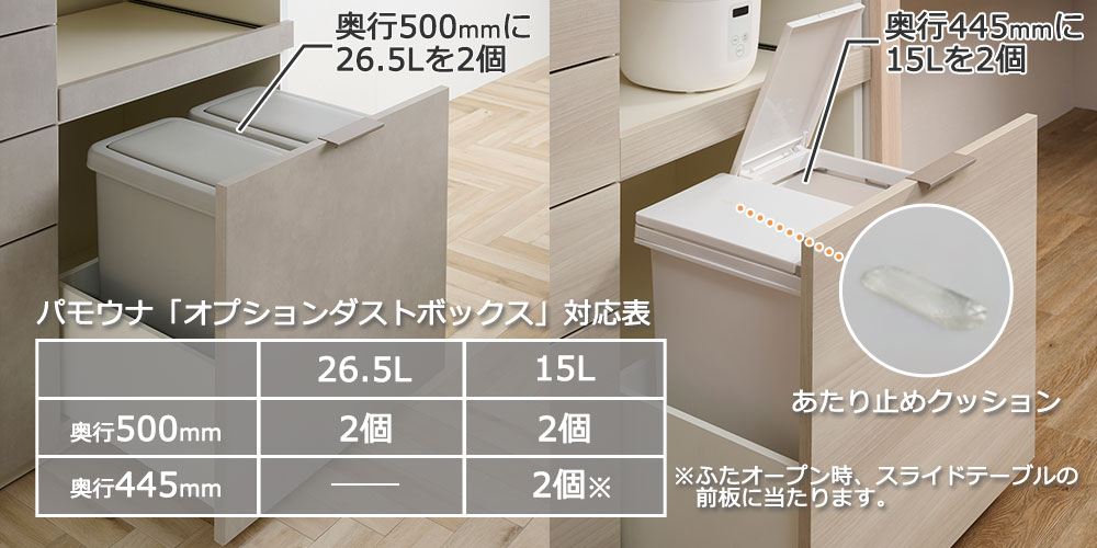 ※奥行445mmタイプに15Lを収納するとふたオープン時に、スライドテーブル前板にあたります。オプションダストボックスに付属の「あたり止めクッション」を貼ってご使用ください。