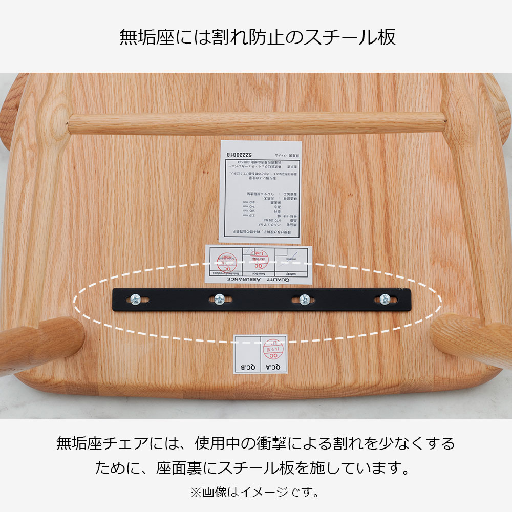 無垢座チェアは、使用中の衝撃による割れを少なくするために、座面裏に割れ防止のスチール板を施しています。