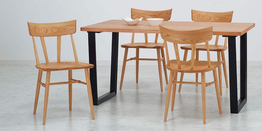 レッドオーク材のほんのり赤みを含む柔らかな色味がナチュラルな空間にマッチするダイニングチェア「シン2」。木座面でありながらも軽さを感じられる設計で、毎日の使用や掃除の際も片手で簡単に移動することができます。