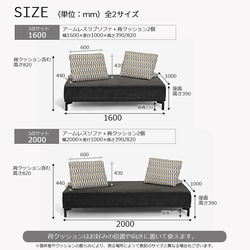 | アームレスラブソファ+背クッション | 幅1600x奥行1000x高さ820/座面高390 |