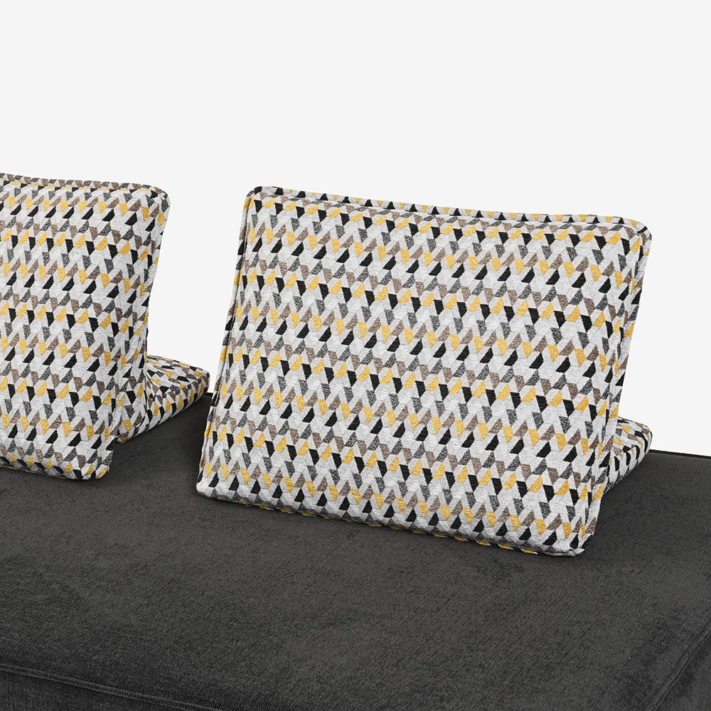 ソファはなめらかな手触りでモダンなダークグレー色(#4_4282)、背クッションは明るいイエローがインテリアのアクセントになる幾何学模様(#4_4350)をセットにしています。ファブリックカバーはご家庭で脱着できるように設計されており、ドライクリーニングも可能です。
