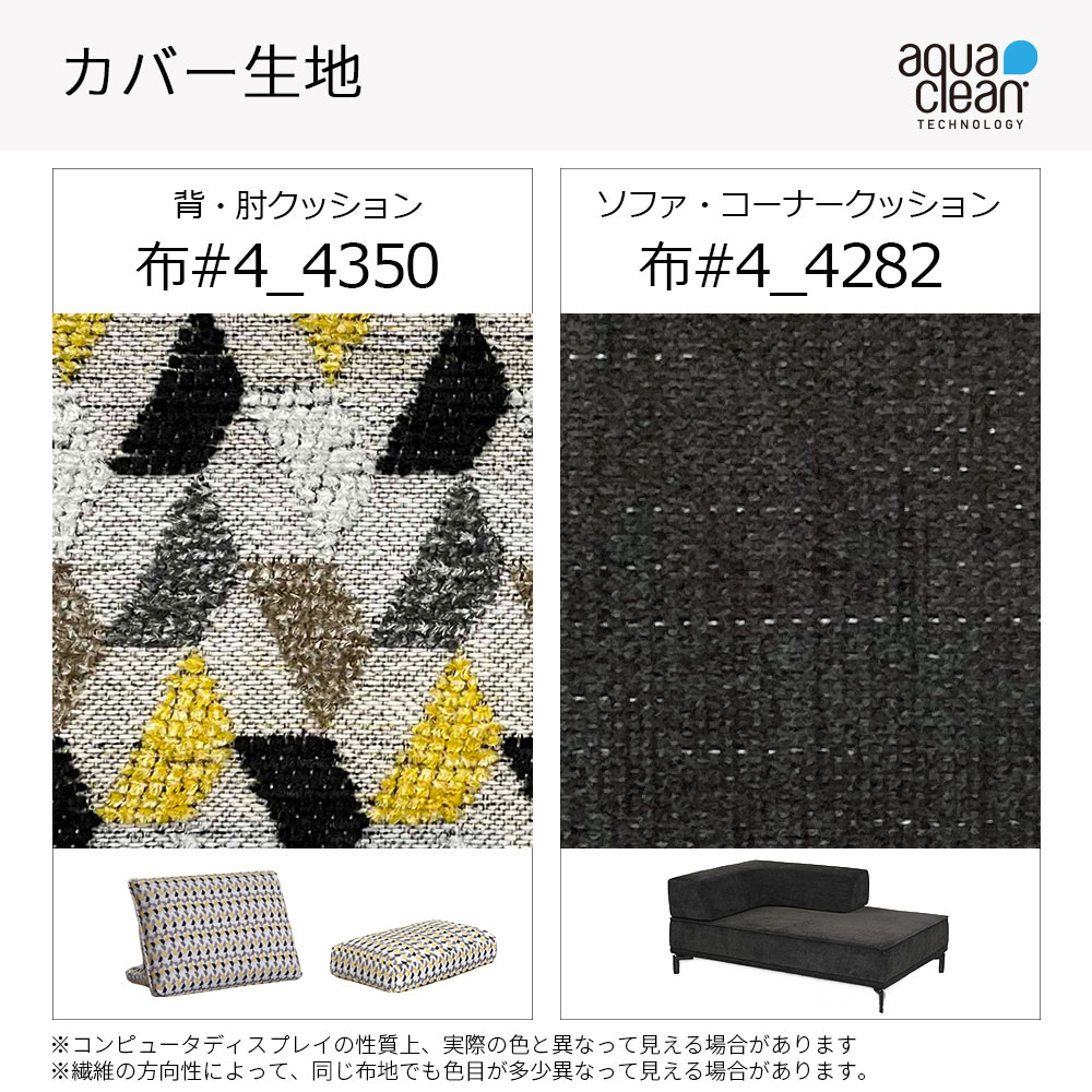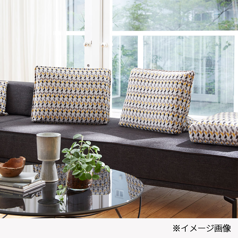 ソファとコーナークッションはなめらかな手触りでモダンなダークグレー色(#4_4282)、背と肘クッションは明るいイエローがインテリアのアクセントになる幾何学模様(#4_4350)をセットにしています。ファブリックカバーはご家庭で脱着できるように設計されており、ドライクリーニングも可能です。
