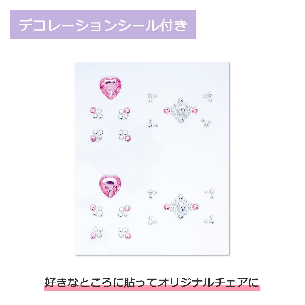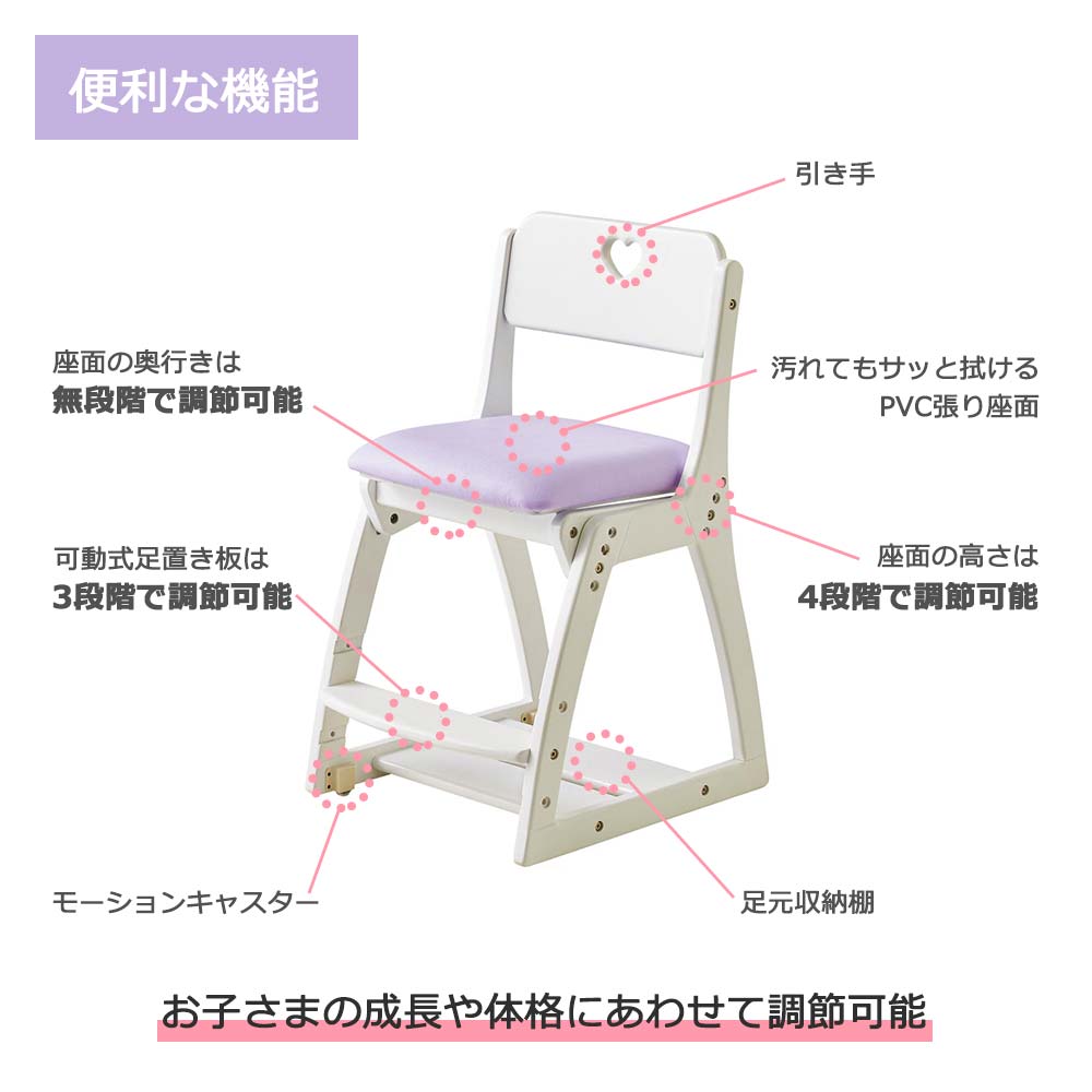 木部のホワイトと座面のパープルのカラーデザインや、引き手のハートモチーフなどがかわいらしい雰囲気です。付属のデコレーションシールを、好きなところに貼ってオリジナルのチェアに。幅広いサイズ調節が可能で、お子さまの成長にジャストフィットするデスクチェアです。
