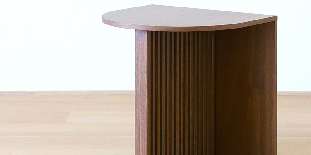 中央の脚にはウォールナット材突板のウッドリブを使用しており、深みのある美しい色合いを活かしたシャープな仕上がりに。デザイン性の高い、豊かな表情のある空間を演出します。半円形の天板と直線的な脚部を合わせたデザインで、サイドテーブルとしてだけでなく、アートや小物をディスプレイしたりと様々なレイアウトを楽しめます。※天然木のため、木目や色に個体差がございます。