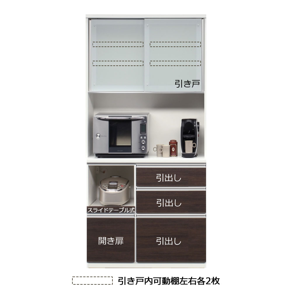 引き戸内には可動棚が左右各2枚あります。カウンター下にはスライドテーブル式の家電収納スペース付きです。