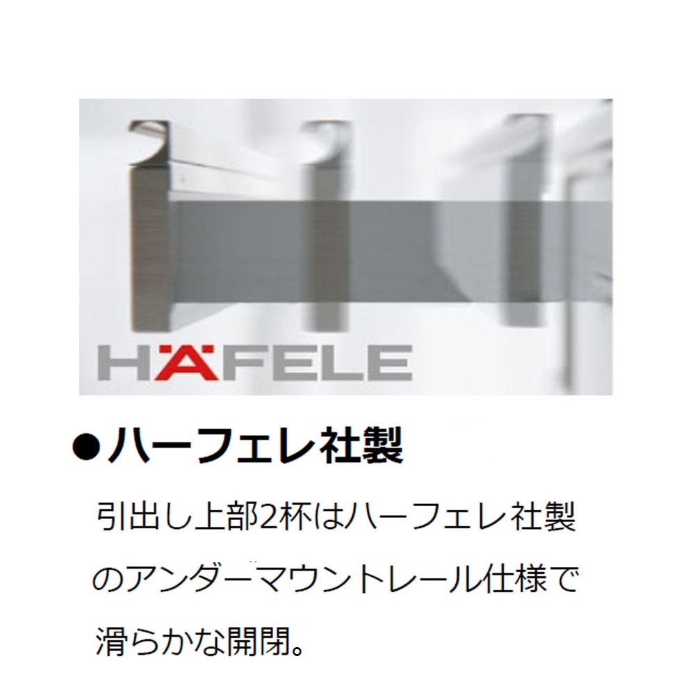 ●アンダーマウントレール:引出し上部2杯は耐荷重25kgのドイツハーフェレ社製のアンダーマウントレールを使用。静かでスムーズな開閉が可能です。※耐荷重量は参考値であり保証値ではありません。