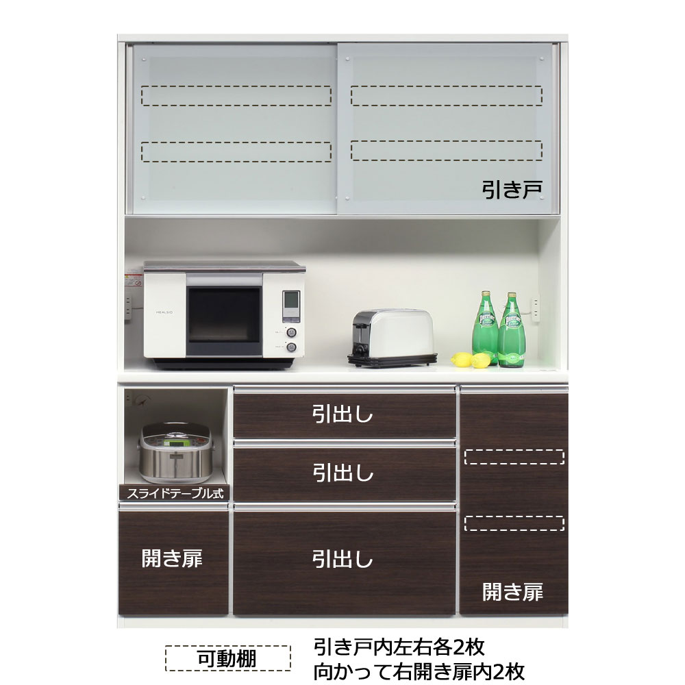 可動棚が引き戸内に左右各2枚と、向かって右の開き扉内に2枚あります。カウンター下にはスライドテーブル式の家電収納スペース付きです。